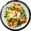 Pasta, mixed vegetables (zucchini, tomatoes, bell peppers), olive oil, garlic, Parmesan
